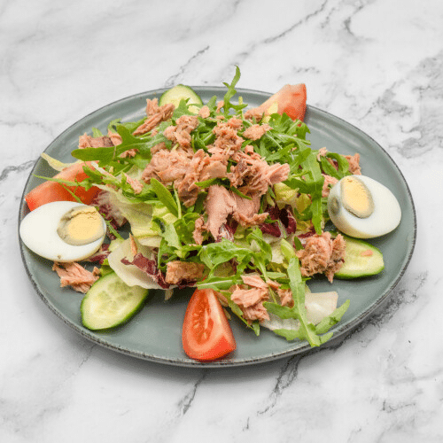 Rucolasalat mit luftgetrocknetem Rinderschinken, Cherrytomaten, Walnüssen, Parmesan und Olivenöl-Zitronensauce